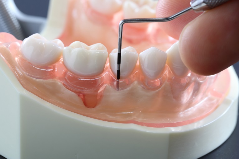 プローブと呼ばれる専用の器具で、歯と歯ぐきの境にある溝(歯周ポケット)の深さや出血の有無を調べます。