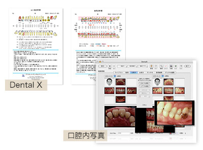 また、DentalXはデータや画像をもとに、診断書(お口の健康手帳)や治療計画書などを作成し書面で印刷することができます。 当院では、これらの資料を患者様にお渡ししています。