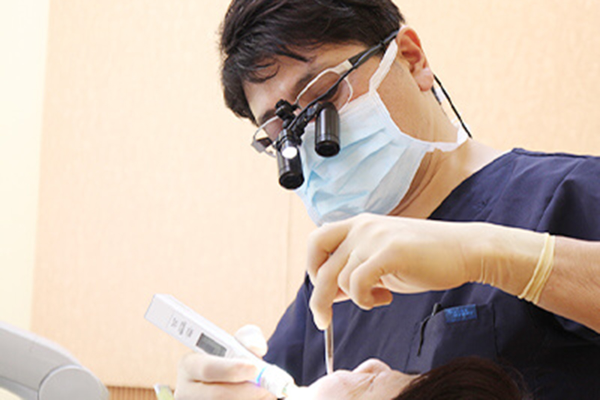 マイクロルーペを使用することで、術野を拡大しながら治療を行うことができます。根管治療時に手探りでなく目視したうえで治療を行うために、当院ではマイクロルーペを使用した拡大視野下での精密治療を行っています。