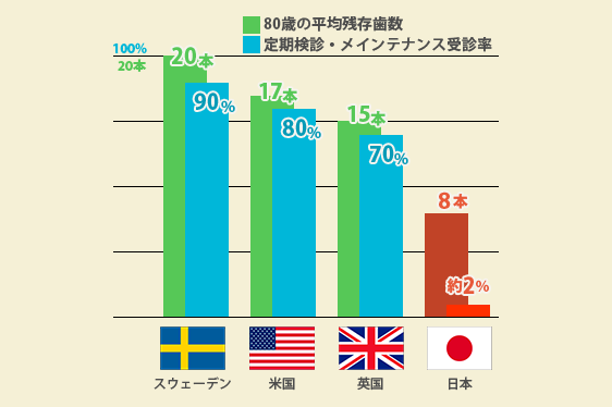 定期検診・メインテナンスが浸透しているスウェーデンでは、80歳で平均20本の歯を保つことができています。一方、日本では、80歳の平均残存歯数はたったの8本(厚労省調べ)です。