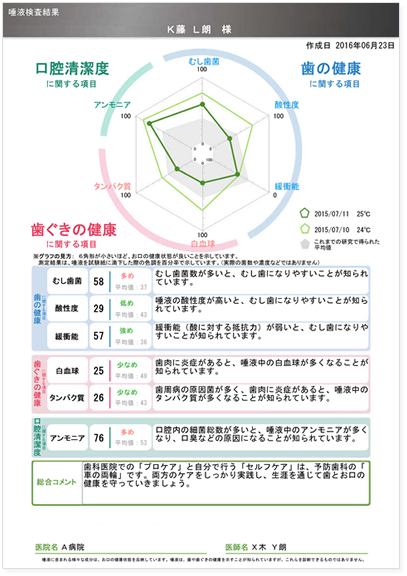 虫歯になりやすいのか、歯周病になりやすいのかを六つの指標を検査し、自分のお口の性格が一目でわかる結果シートをお渡しします。