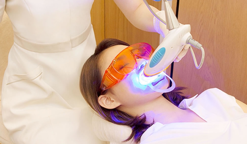 歯科医院で歯の表面に薬剤を塗布し、その上から特殊な光をあてて歯を白くします。初めてホワイトニングする方にも安心な低濃度で行っています。